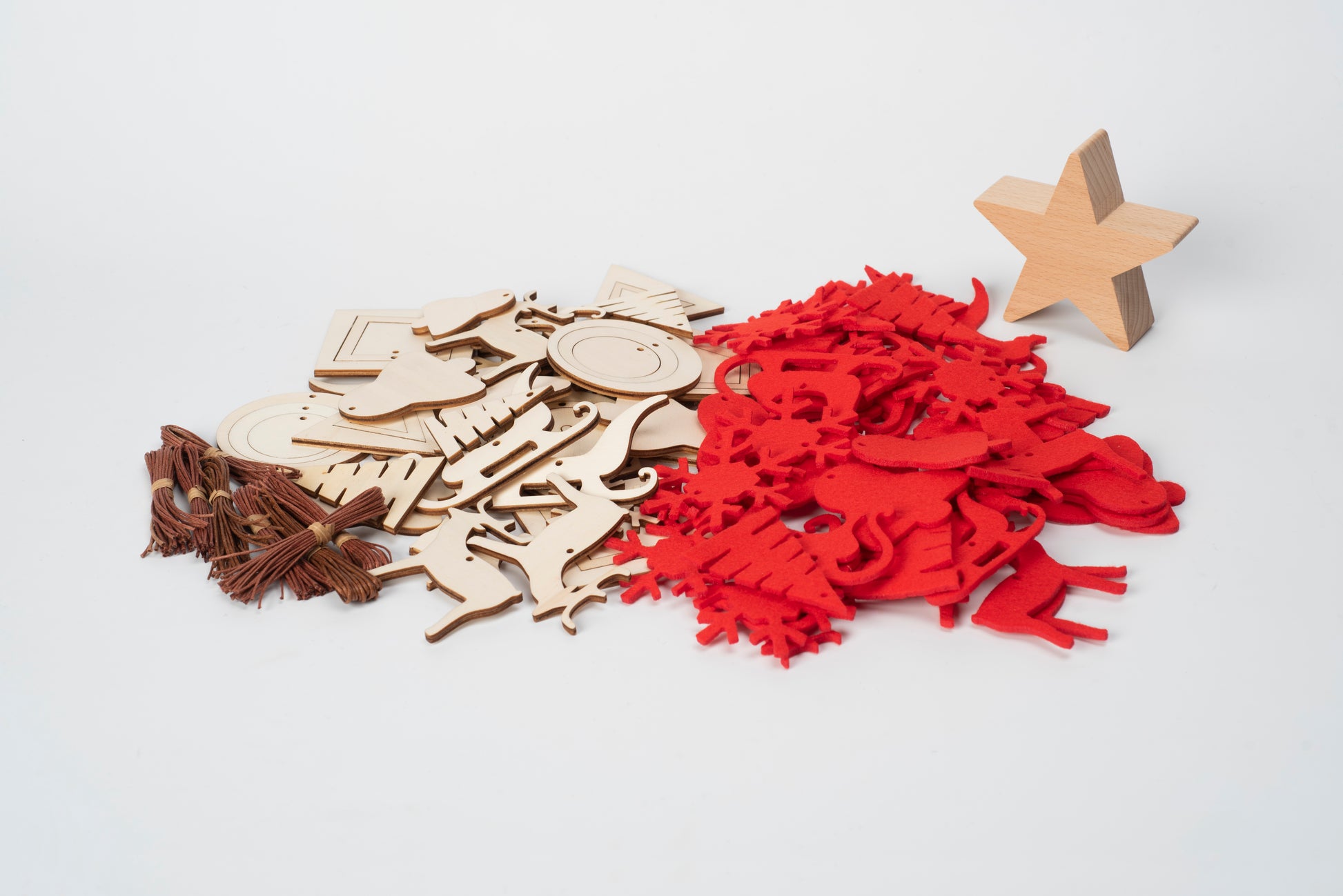 Το σετ περιλαμβάνει ξύλινο δέντρο με αστέρι και κατάλληλο αριθμό στολιδιών από κόκκινη τσόχα και ξύλο. Περιλαμβάνονται κορδόνια για κρεμαστά.