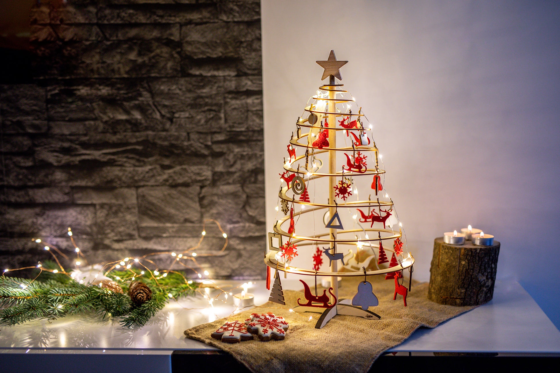 Ξύλινο δέντρο με χριστουγεννιάτικα στολίδια από ξύλο και τσόχα και ξύλινο επάνω μέρος με αστέρι. Τα στολίδια έχουν μέγεθος 3 έως 5 εκατοστά. Η συσκευασία περιλαμβάνει και κορδόνια για το κρέμασμα της διακόσμησης.